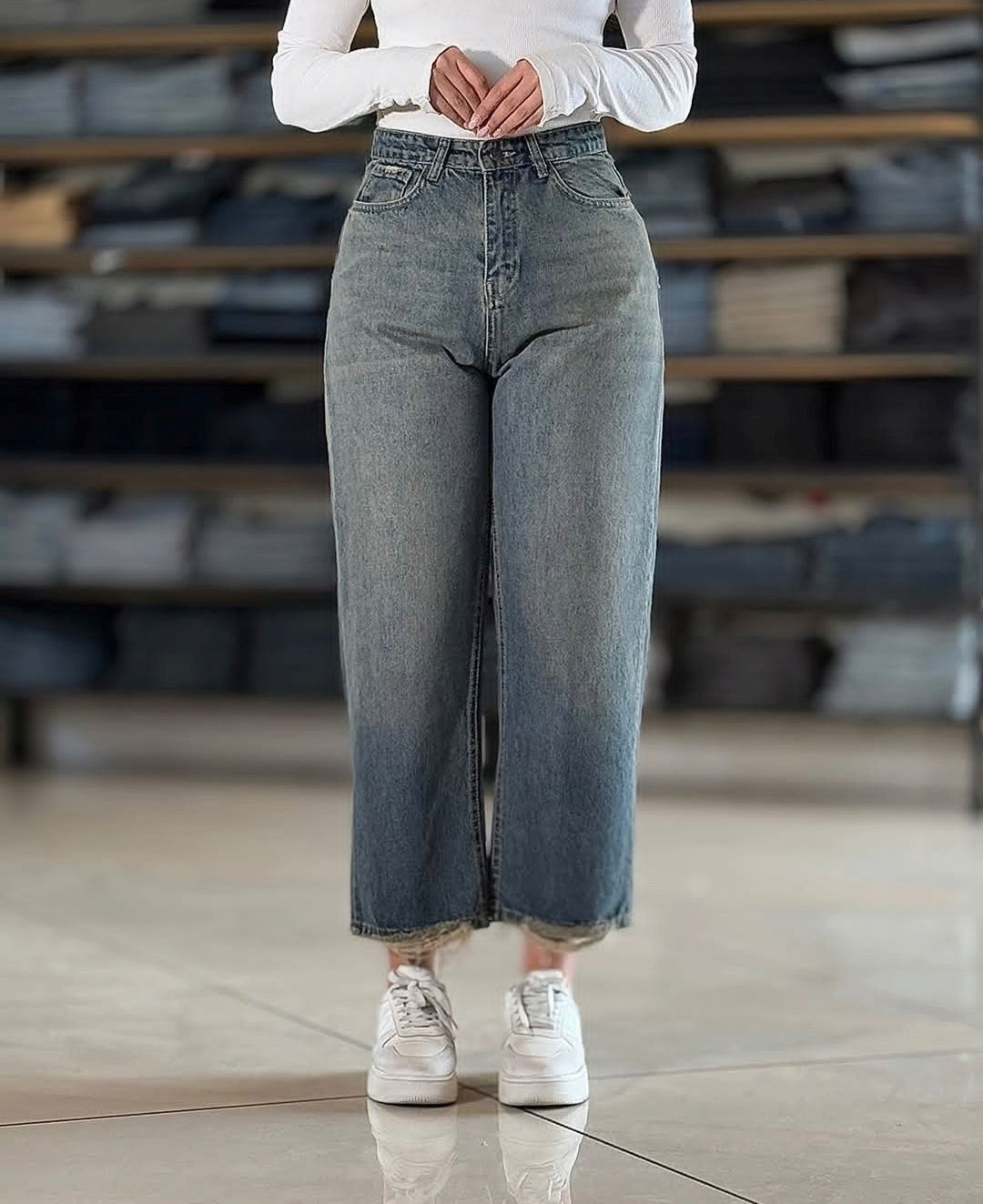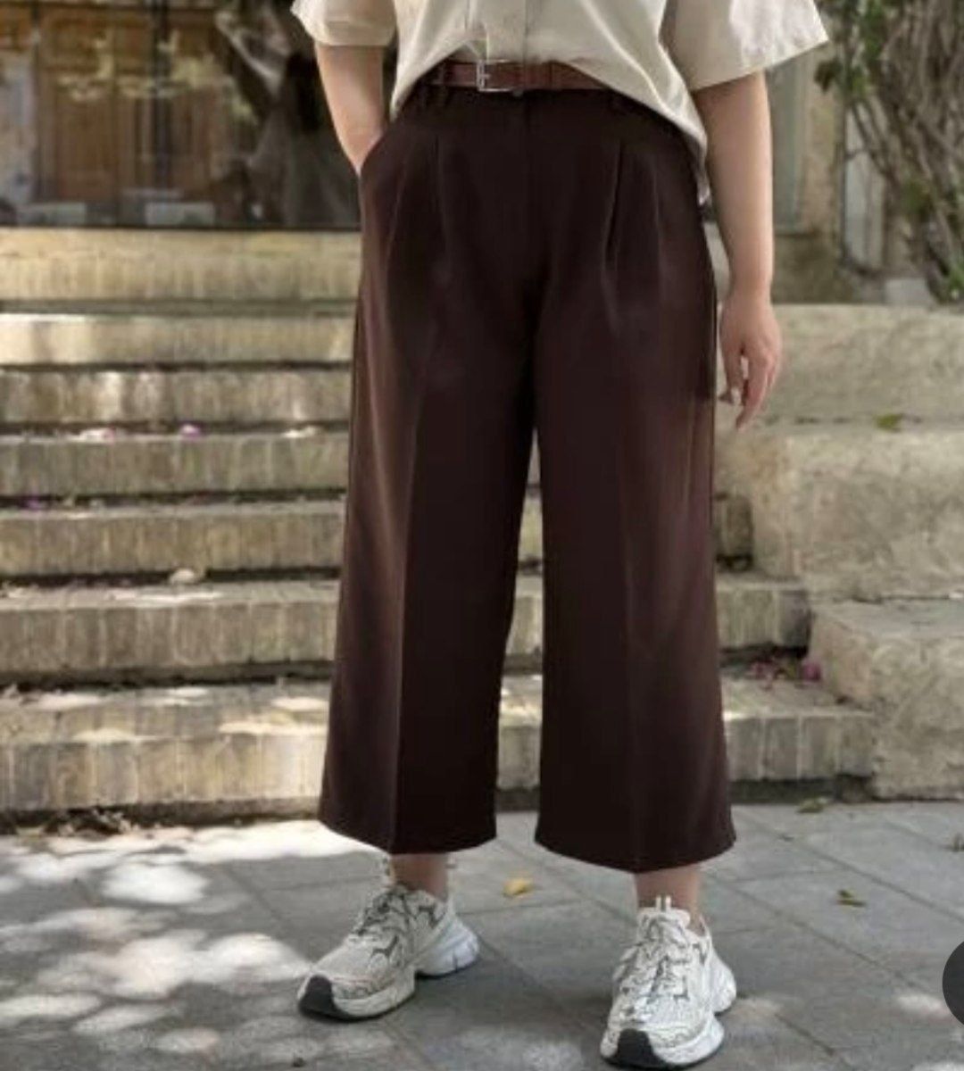 شلوار واید لک گازوئیلیسایه دار پارچه ترک کمر ساده